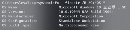systeminfo | findstr /B /C:"OS"会显示系统信息,如图: