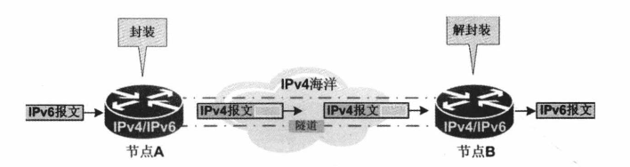 - 节点A将IPv6报文封装在以节点B的IPv4地址为目的地址、以自己的IPv4地址为源地址的IPv4报文中,并发往路由