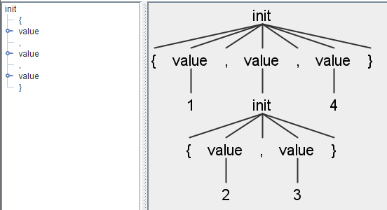 init : '{' value (',' value)* '}' ; // 至少有一个Value