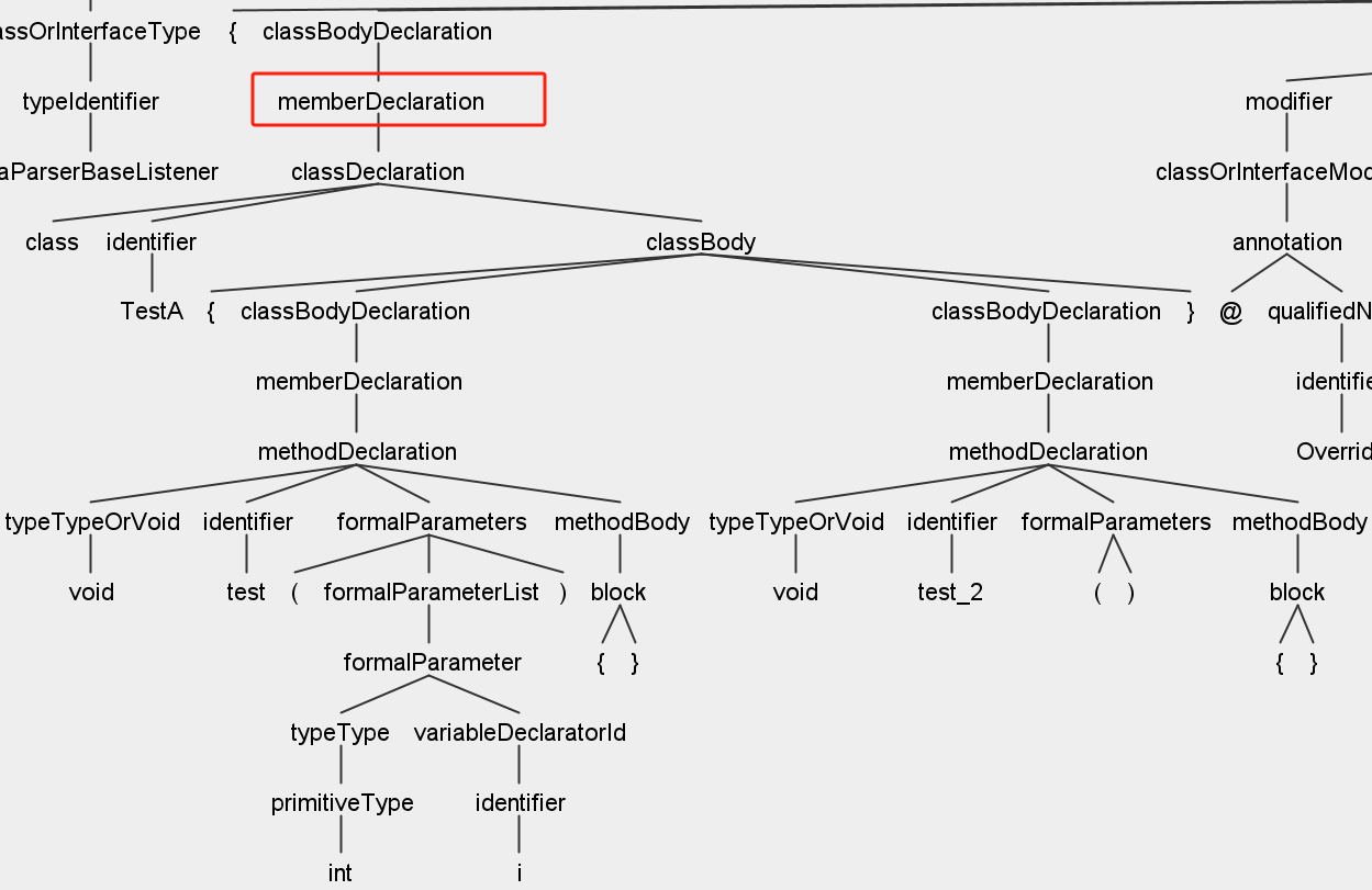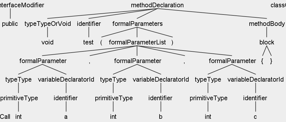 这是一个签名为void test(int a, int b, int c)的方法,那么语法树解析后是这样的;那么我们从MethodDeclarationContext中拿到的formalParameters实际上还需要再进入其formalParameterList,然后再通过索引获取到所有的formalParameter才行,具体如下: