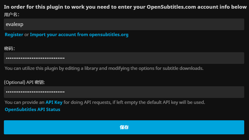 在我的插件中,打开该插件设置,配置Open Subtitles用户信息: